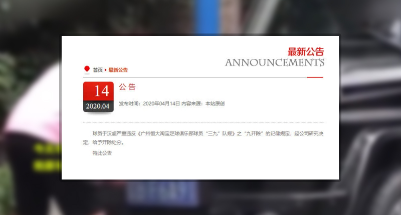 恒大俱乐部公告表示:“球员于汉超严重违反《广州恒大淘宝足球俱乐部球员“三九”队规》之‘九开除’的纪律规定,经公司研究决定,给予开除处分。”